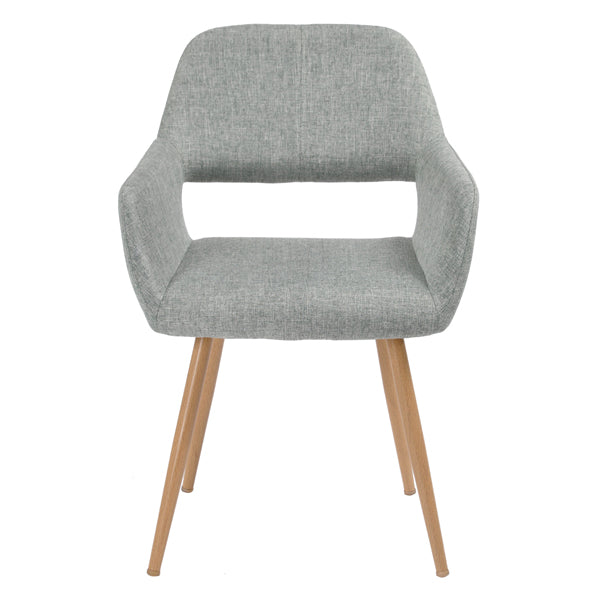 Silla tapizada en tela chenille, patas de metal con impresión transfer color madera.