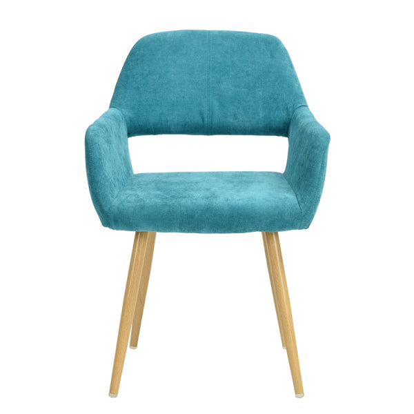 Silla tapizada en tela chenille, patas de metal con impresión transfer color madera.